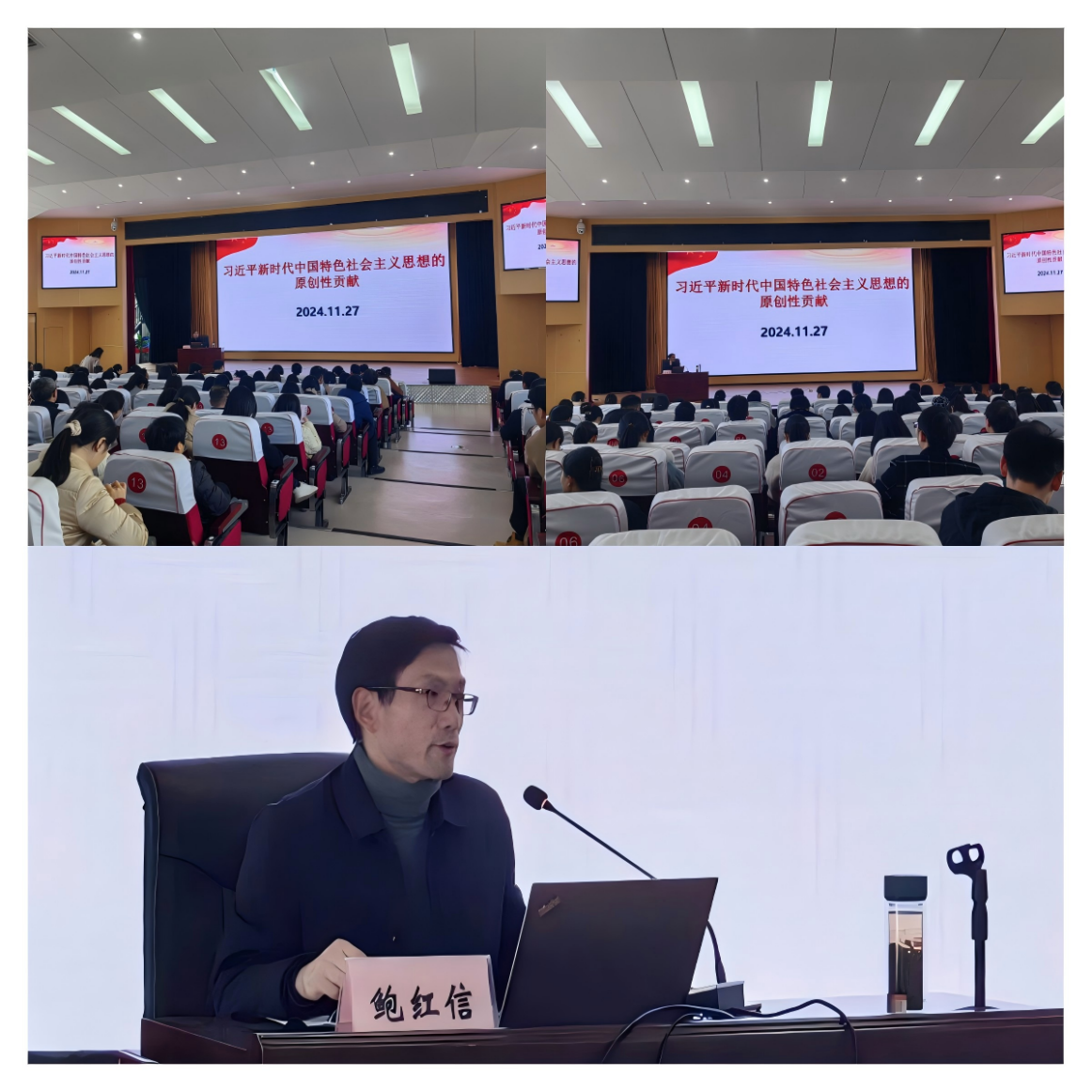 11月27日下午,特邀池州学院马克思主义学院副院长鲍红信博士,为全体教师作题为《习近平新时代中国特色社会主义思想的原创性贡献》的专题讲座。鲍院长围绕习近平新时代中国特色社会主义思想的的原创性成果及其对教育工作的指导意义展开讲解。讲座理论联系实际,语言生动凝练,教师们对新时代教育工作的重要使命和责任有了更深刻的认识。